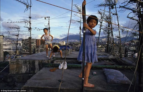 吉拉德尤其迷恋城寨的天台,因为满眼密密麻麻的城寨天台鱼骨天线,就像大漠迷城长满干枯的植物。黄昏下,吉拉德的镜头很热闹,孩子在天台做功课,老者乘凉,大人收晾衣服。天台迷住吉拉德,还因为天台可以看到飞机降落前的一刻,从城寨西边拐弯掠过天空,直入启德机场。每一次飞机降落拐弯,城寨的天空都好像快要经历一次有惊无险的空难。