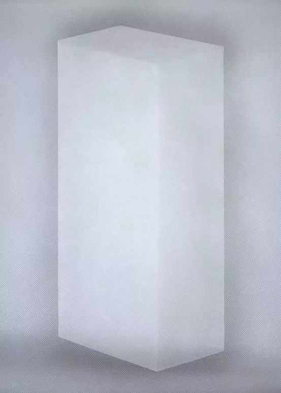 于是,在重重问题的驱使之下,刘月走上了证伪的过程。他先将真实的形态(圆柱体、圆锥体、立方体等等)拍摄下来,并用电脑排除其特征和质感,仅剩下一幅黑白的网格背景的三维空间图,再将其打印出来,作为拍摄的原始素材。之后通过纸张的变形以及拍摄角度的调整,最终把纸上的“三维立体图”重塑成不存在于现实中的二维标准形体。在这个过程中,二维和三维几经转换:现实中的三维形体先是在纸上成了二维的原始图像,而这张纸又成了新的三维立体模板,被相机再次记录在二维之中。拍摄过程的反复调整让二维和三维不断地相互对抗,纠缠不清,一直被推导至最后的绝对“完美”。作品中呈现的正是这个“完美”瞬间,特别是当它和地上的原图相互比较之后,会觉得画面中的形体没有了任何人为的痕迹,甚至几乎看不出是一幅摄影作品,更像是用最标准的机械手段制造而成的。我们很难想象艺术家到底经过了多少次的试验,最终得到了画面中的“唯一”。